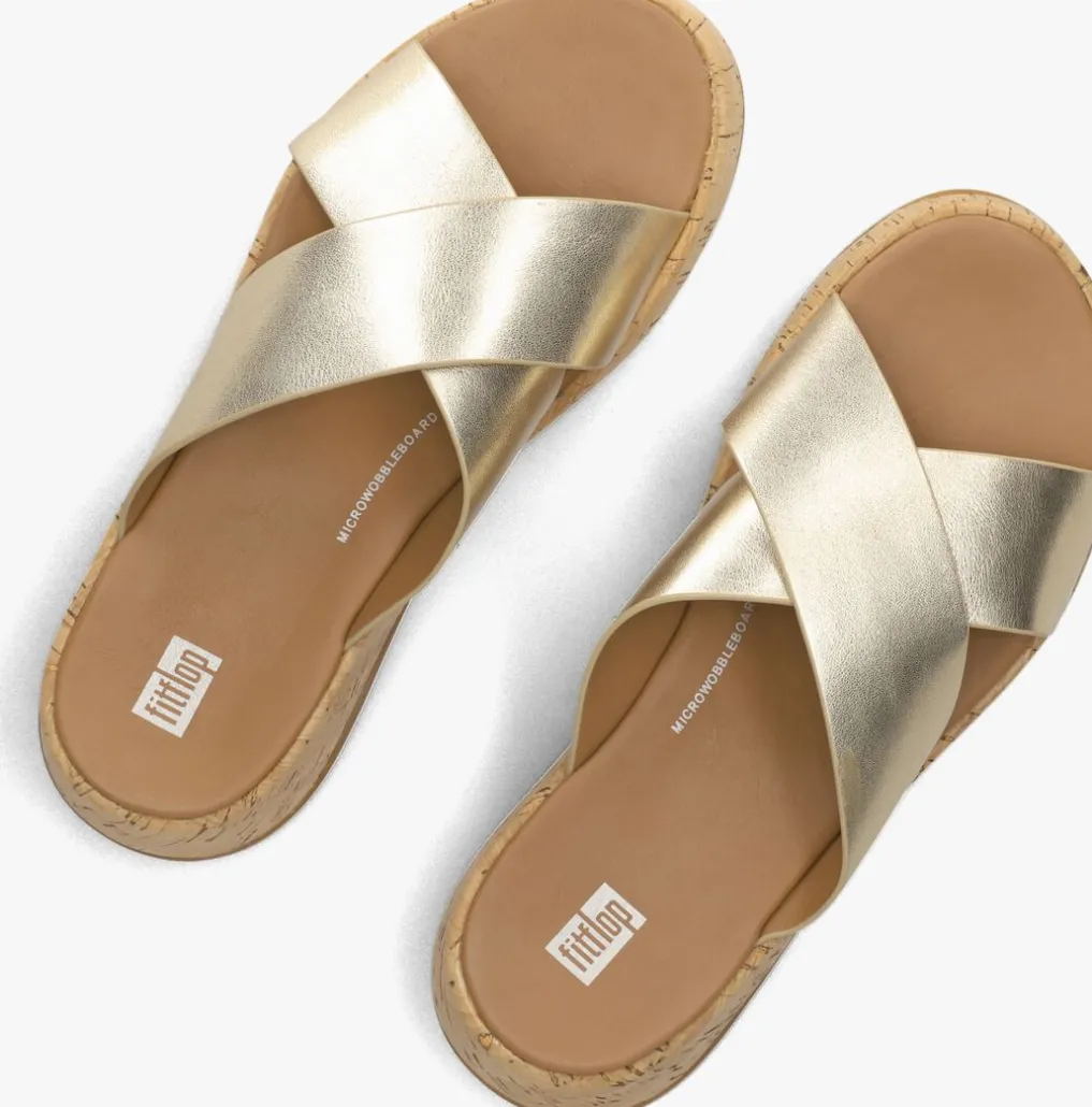 Damesslipper model FT7 in het goudkleurig van FitFlop. Deze goudkleurige teenslipper voor dames van het merk FitFlop. Deze teenslipper is uitgevoerd met een gekruiste brede lederen band. De binnenvoering is van leer, het voetbed is van rubber. De zool meet circa 4,5 cm en is uitgevoerd in kurk look. Verder heeft de rubberen loopzool een fijn profiel.