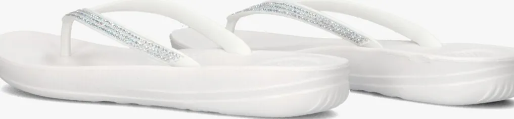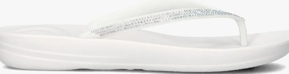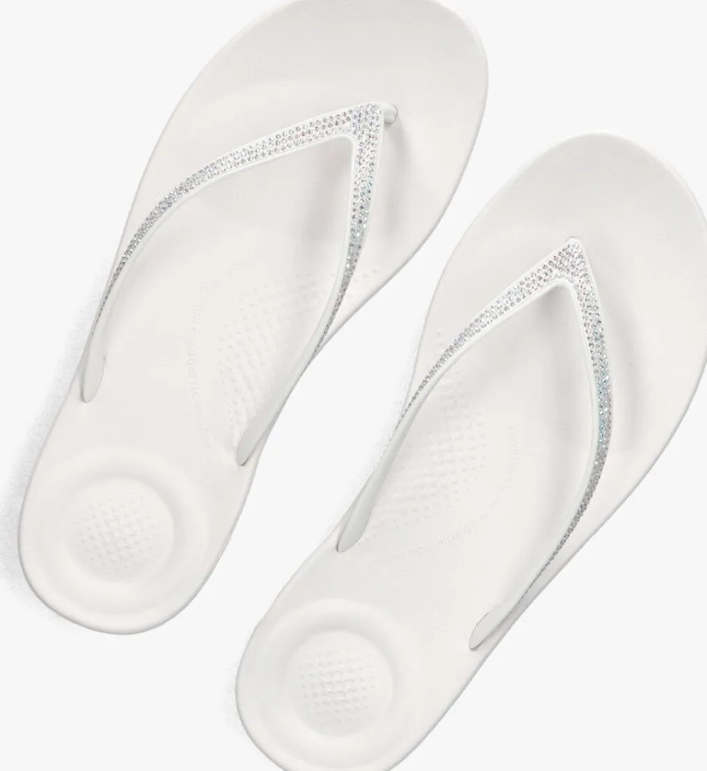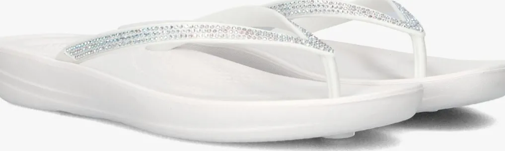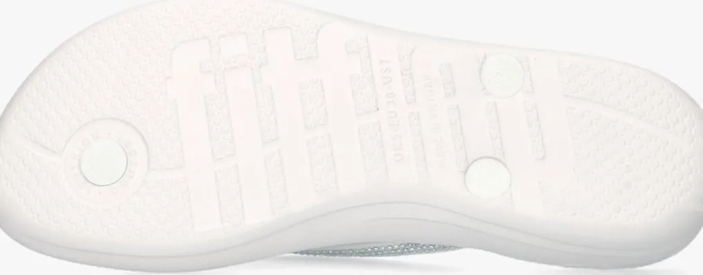 Witte teenslipper met strass voor dames van het Britse merk FitFlop. Kwaliteit en comfort, dat is waar dit Britse schoenenmerk voor staat. De speciaal ontwikkelde middenzool zorgt voor een ultiem draagcomfort en maakt dat de druk op de voetzool verspreid wordt. Zo ook met deze teenslipper, uitgevoerd in het wit met bijpassende strassstenen. De binnenvoering is van leer, het voetbed is van rubber. Verder heeft de rubberen loopzool een fijn profiel voor een stevige grip.