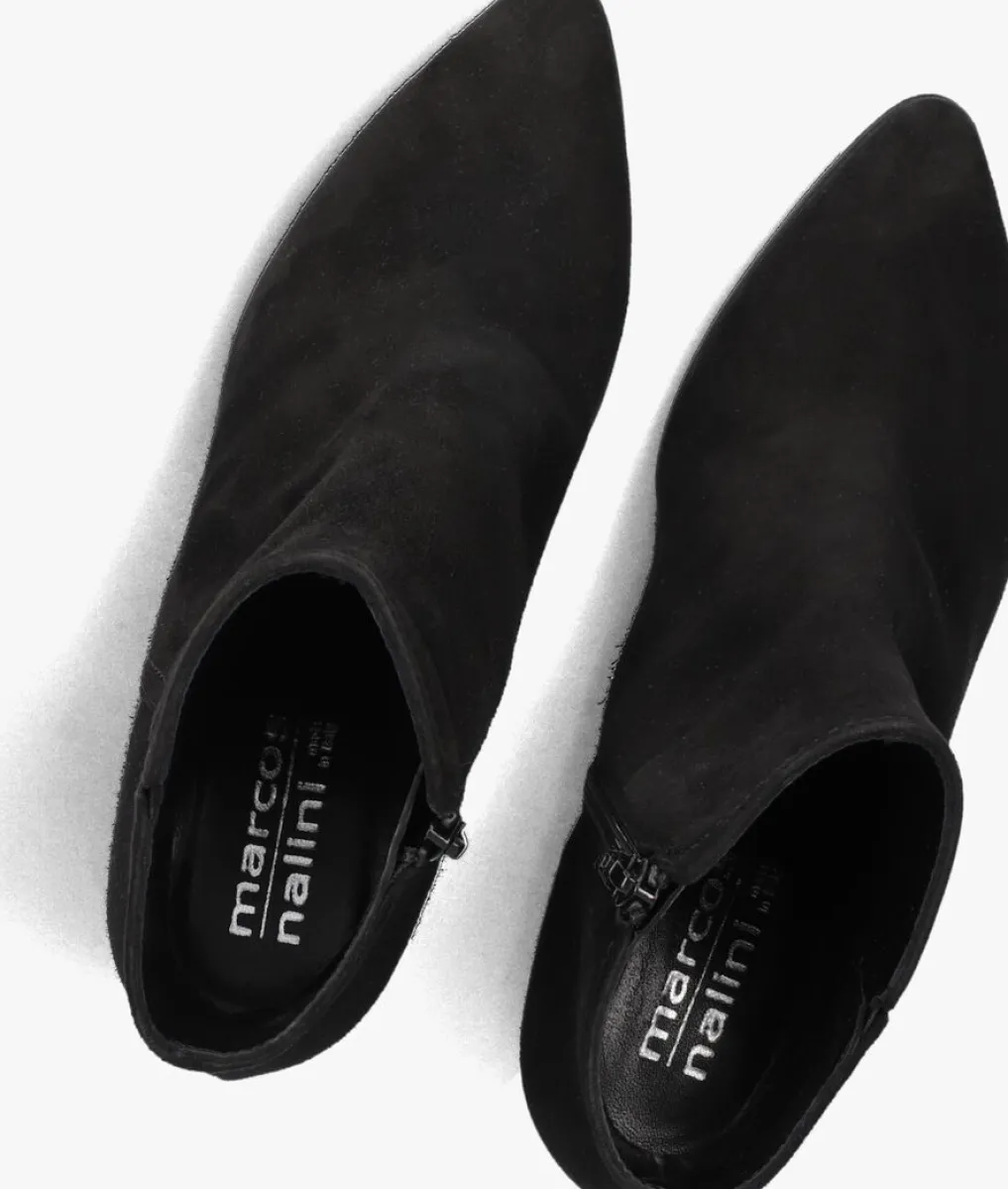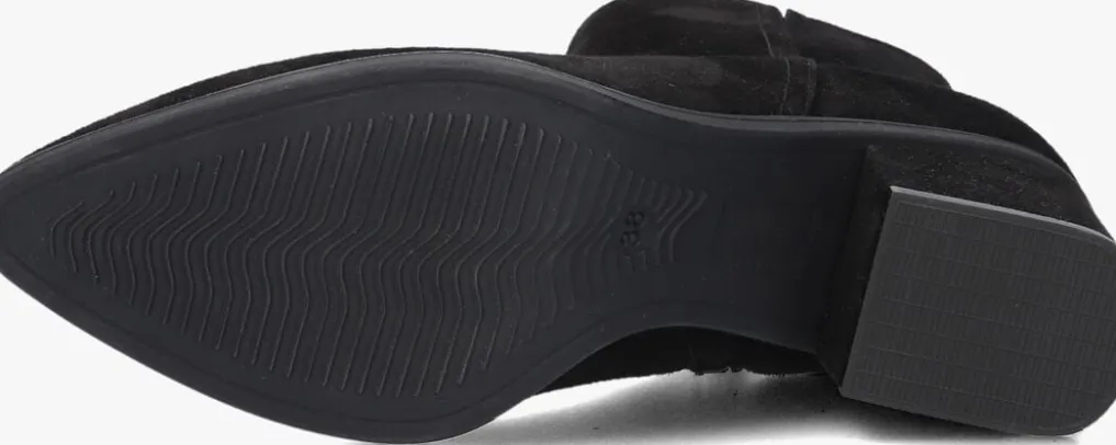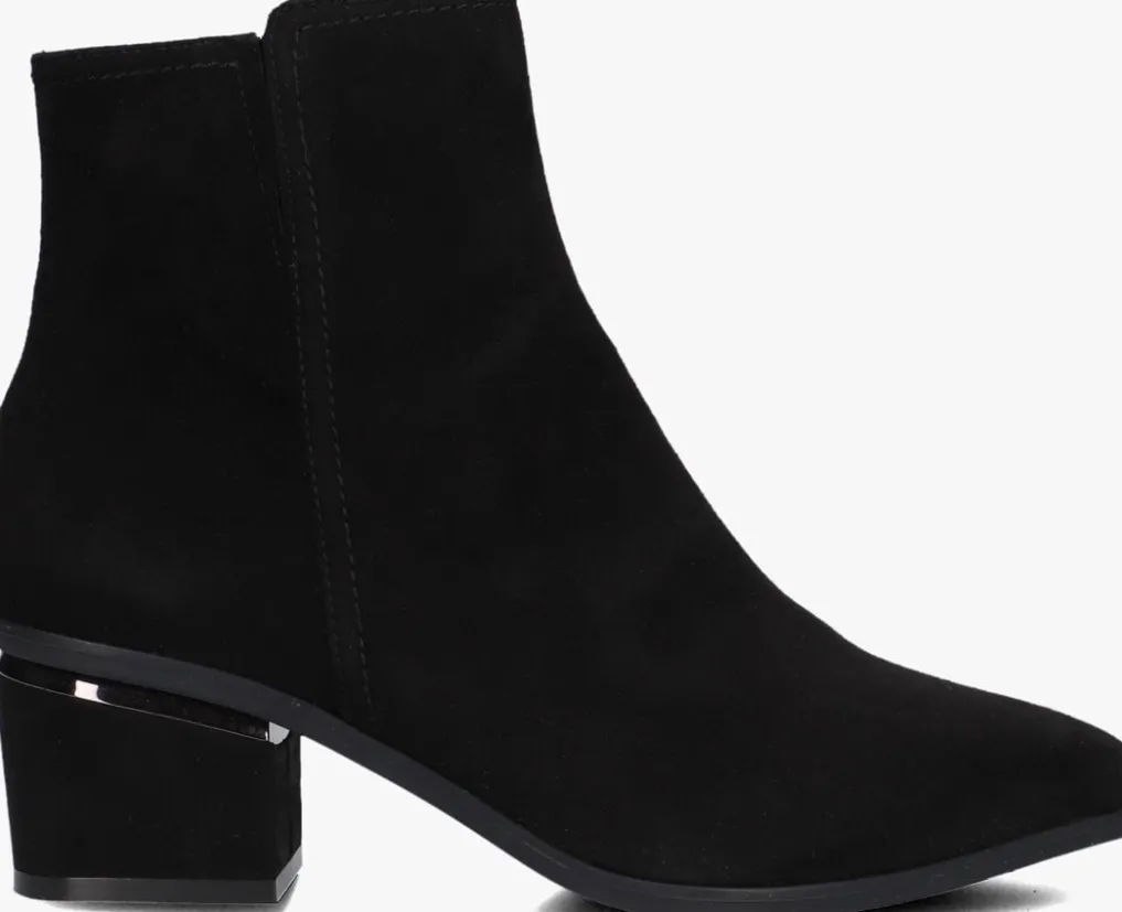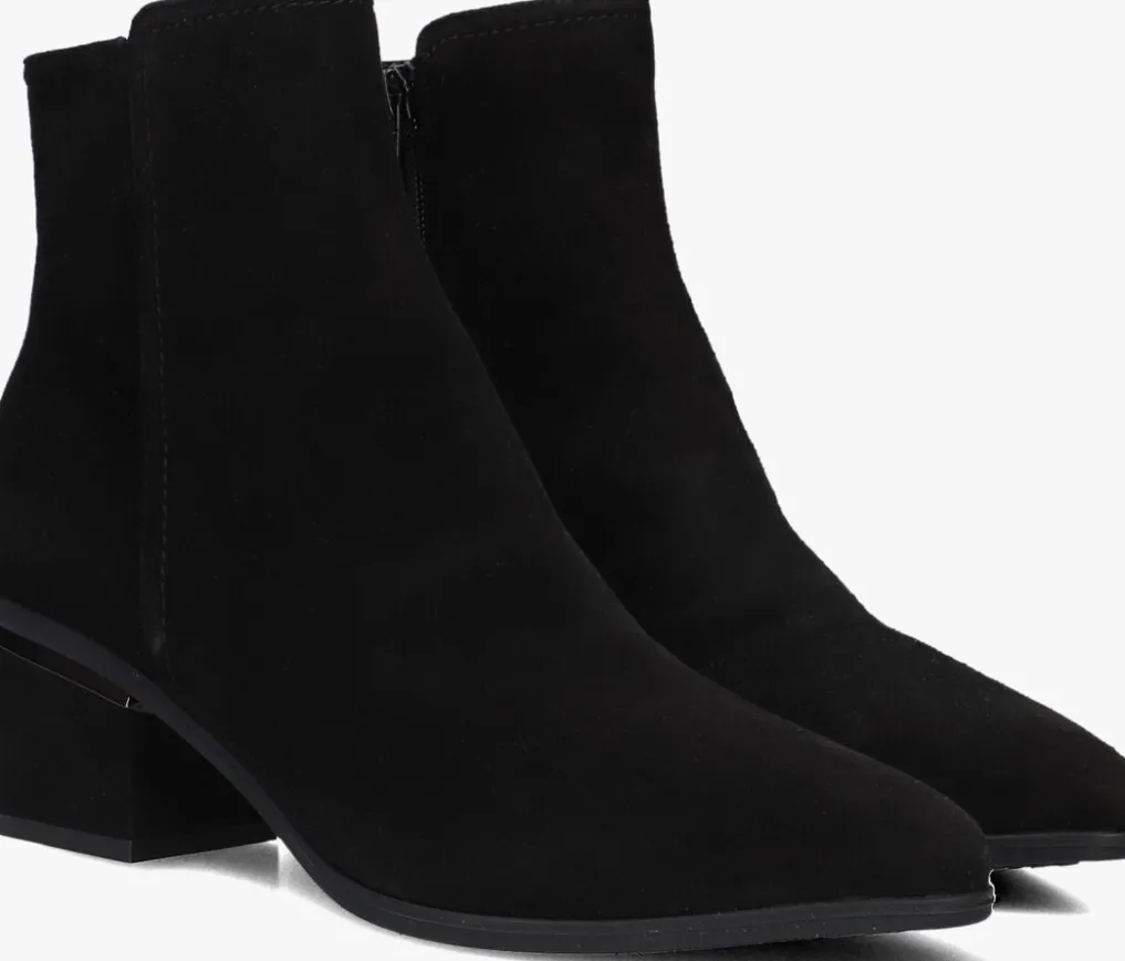 Deze enkellaars met spitse neus is uitgevoerd in zwart suède. De binnenzijde van schacht bevat een rits. De binnenkant is uitgevoerd in leer en een stevig contrefort draagt bij aan het loopgemak. De hak meet circa 5 cm. De rubberen loopzool heeft een medium profiel voor stevige grip.